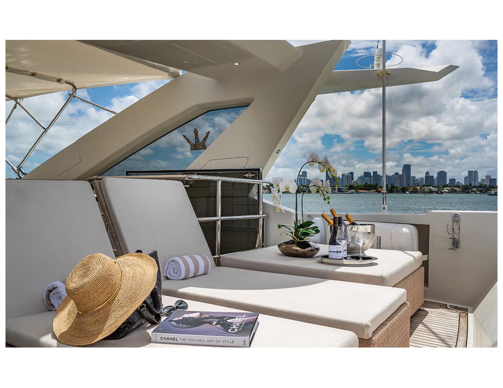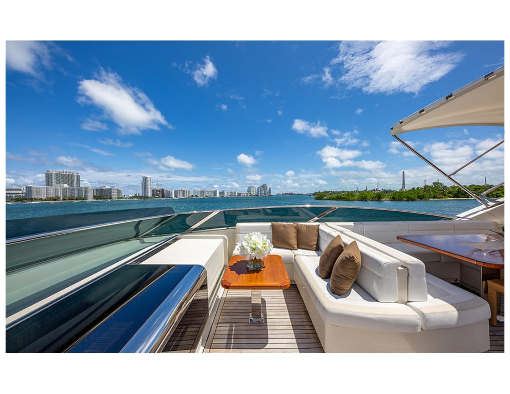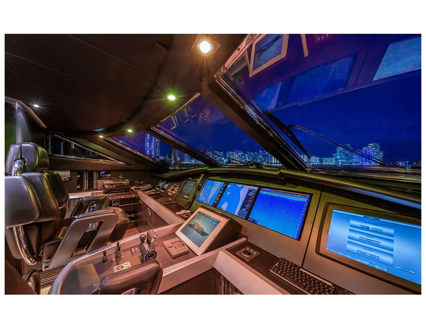 Completely refit in 2016, the 95 ft Dominator yacht accommodates up to 8 guests in 4 elegant staterooms. Her hand crafted interior is adorned with the finest selections of wood and soft furnishings meant to please discerning guests from around the world. The main salon features an open kitchen with the feel of a luxurious home. With original artwork throughout, she is truly a unique yacht and no wonder a Miami favorite.